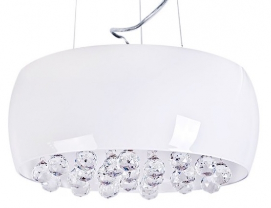 Wysokość: 120cm. Średnica: 40cm. Ilość źródeł światła: 5xG9 Obudowa; metal/chrom Klosz: opal połysk/kryształ Możliwość montażu w formie plafonu